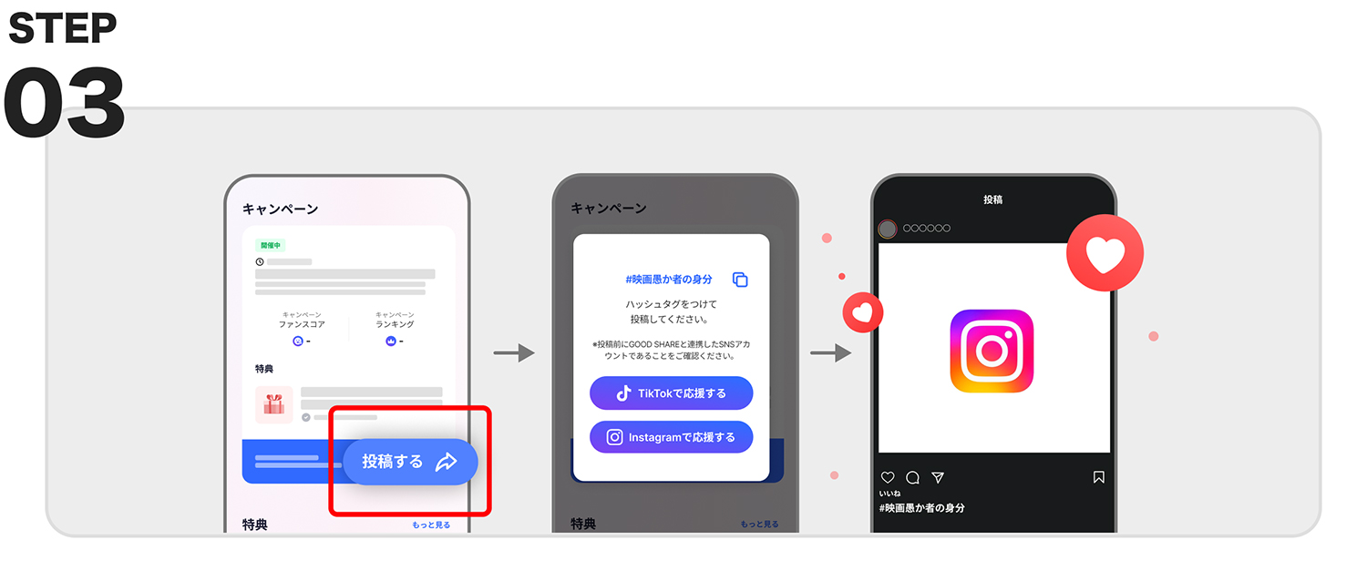キャンペーン期間中にスマートフォンアプリ「GOOD SHARE」に登録し「#映画愚か者の身分」のハッシュタグをつけて、映画『愚か者の身分』にちなんで「私が愚か者だと思った瞬間」をInstagram または TikTok で投稿してください。